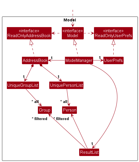 PersonorGroupobjects (e.g., results of a search query) as a separate filtered list which is exposed to outsiders as an unmodifiableObservableList<Person>that can be ‘observed’ e.g. the UI can be bound to this list so that the UI automatically updates when the data in the list change. - stores a