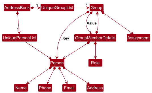 The project introduced a new object: Group, alongside a relational object GroupMemberDetail that describes students’ details inside a particular group. This requires us to ensure that data is synchronized through the user workflow by making sure that our Maps and Lists point to the same object by reference. In particular, since Person is hashed by name, we had to take caution when allowing editing of name. To deal with this, we introduced 2 new data structures: ArrayListSet and ArrayListMap. These classes have the interface of Set and Map respectively, but are internally stored in ArrayList objects so that editing the key objects does not change our key values. This is important since we use Person as a key for our Map of GroupMemberDetail and that hashCode() hashes Person based off its name.